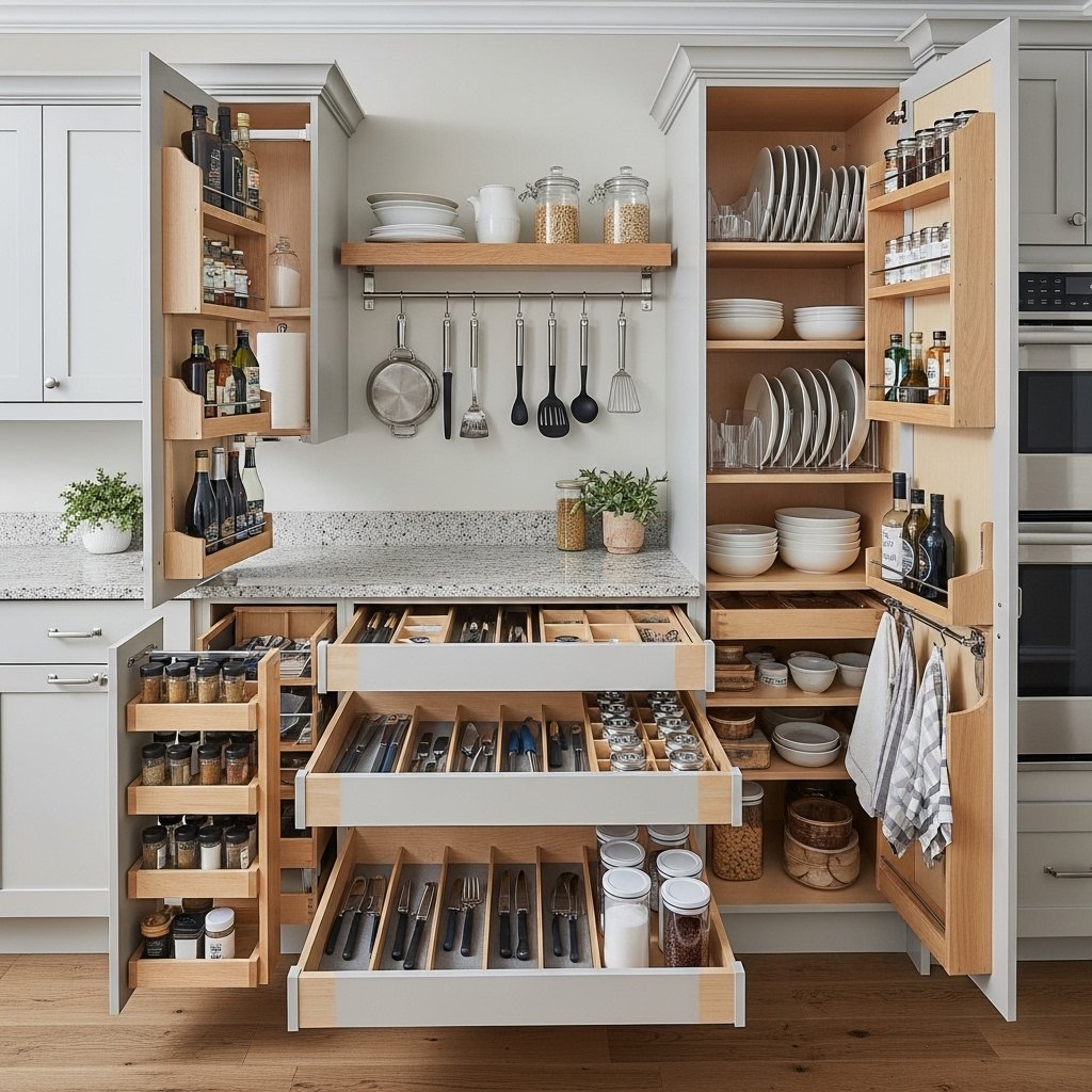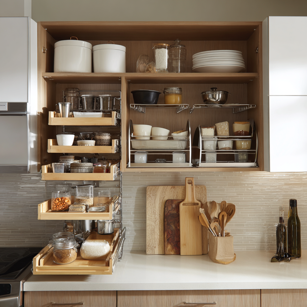 Maximize every inch with pull-out drawers, vertical racks, hanging rails, and cabinet organizers. Smart storage keeps the kitchen tidy and improves daily functionality.