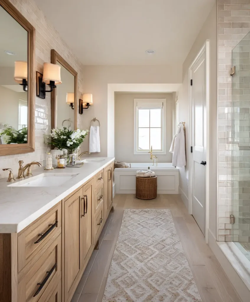 Pro Tip: Keep décor minimal—white towels, rattan baskets, or woven rugs complement without overwhelming.
