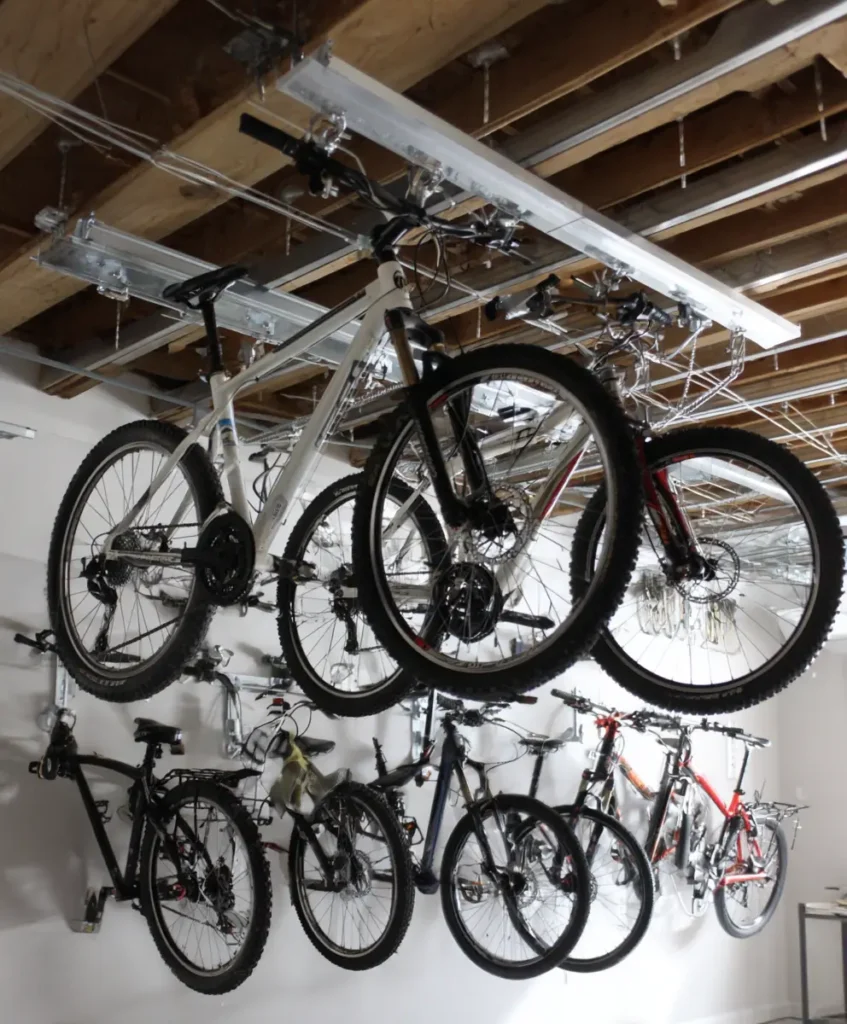 For cyclists, a ceiling-mounted pulley keeps bikes out of the way but accessible.